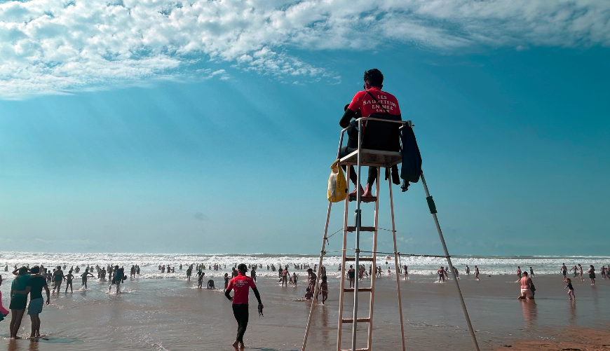 « En matière de sécurité, on fait surtout attention à ce que les baigneurs restent bien dans la zone surveillée, développe Mewen. Si jamais ils en sortent à cause des forts courants, on va être encore plus attentifs pour voir si c’est maîtrisé ou s’il faut qu’on intervienne. » Comme des poissons dans leur élément, les sauveteurs n’hésitent pas à se mettre à l’eau pour cadrer les nageurs. « Sur ces plages, ça devient un vrai travail stratégique, en plus de l’effort sportif, affirme Thibault Seuwin. Il faut constamment s’adapter. »