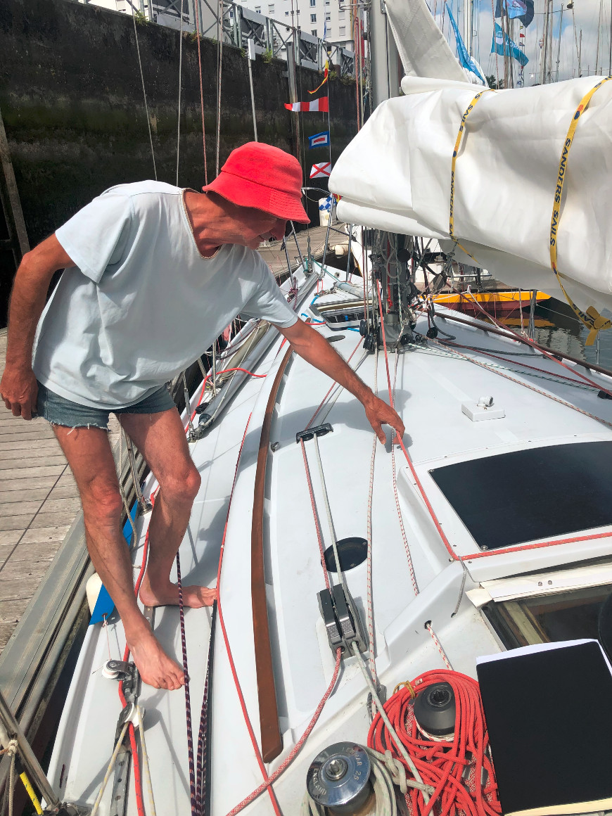Pourquoi, parmi quantité de bateaux de monsieur Tout-le-Monde, plus abordables financièrement, le bateau anglais Contessa 32 – qui date des années 1970 – est-il devenu une sorte de chouchou ? Les deux autres voiliers ayant levé l’ancre de Lorient le 11 août sont des Contessa 32. Pierre-André Huglo a embarqué pour sa deuxième Longue Route avec le sien, baptisé Fresh Herring.