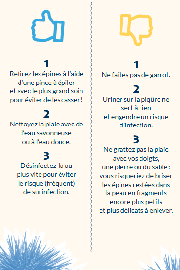- Ne grattez pas la plaie avec du sable, ni avec une pierre, ni avec les doigts car vous risquez de casser les épines se trouvant toujours sous la peau ; elles se briseraient alors en fragments qui seraient encore plus petits et plus délicats à extraire.